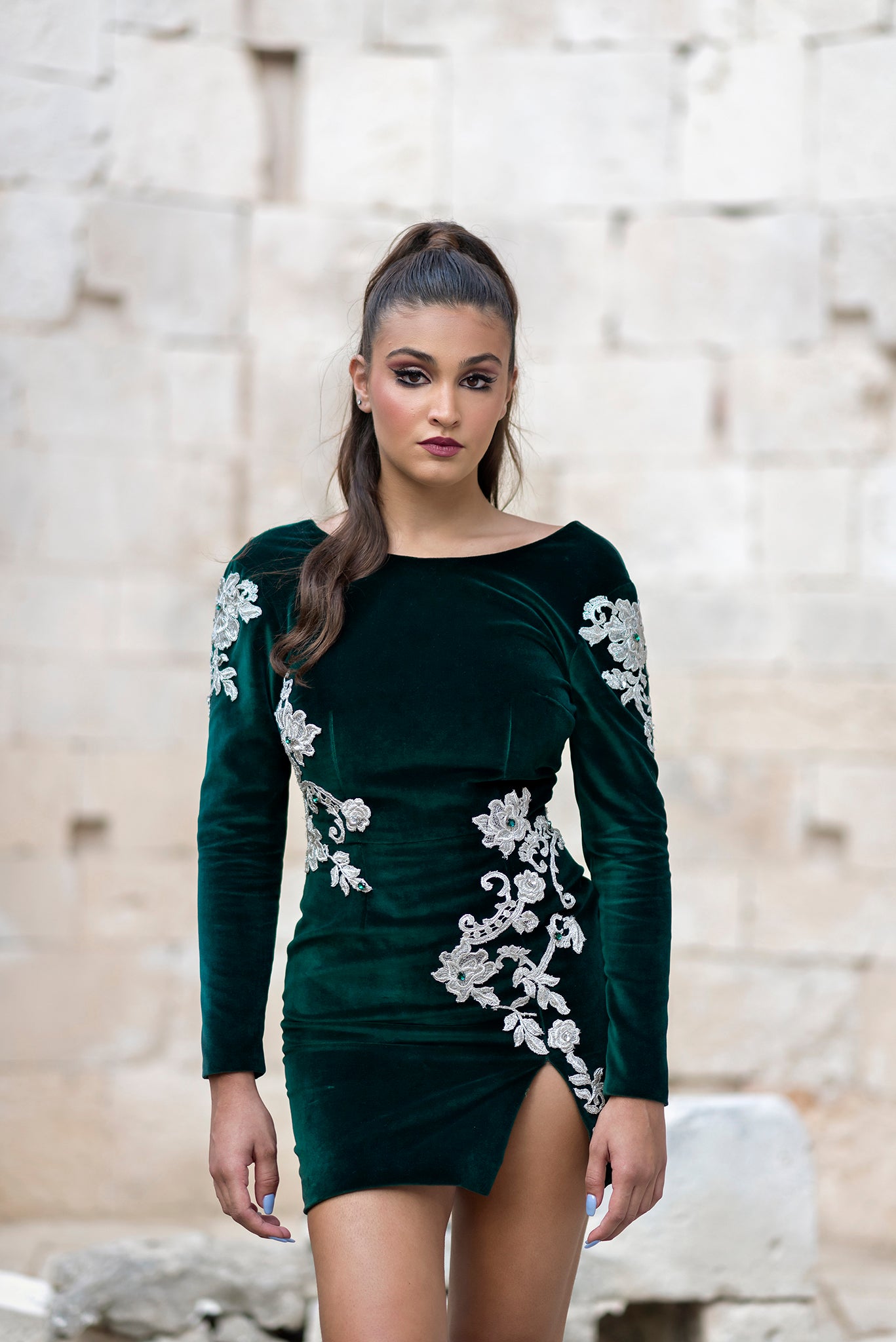 Abito modello a tubino in velluto liscio verde di alta moda, arricchito da pizzo macramè di altissima qualità finemente cucito a mano. Sul pizzo sono state applicate gemme preziose bianche e smeraldo per dare ancora più luminosità al capo. Spacco sulla gamba sinistra e chiusura sul dietro a cerniera. Foderato internamente in argento. Elegante e adatto alle occasioni più romantiche, per una donna che vuole sentirsi femminile e sensuale al punto giusto.