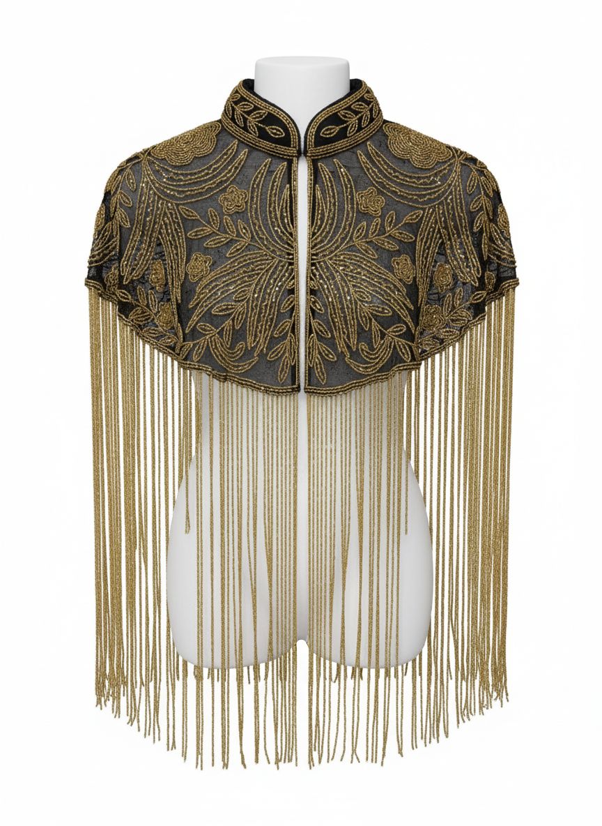 ALULA è una mantella gioiello in edizione ultra limitata, realizzata su base di tulle nero con ricami interamente eseguiti a mano, impreziosita da perline e dettagli couture. Completa di frange applicate lungo l’intera circonferenza, si posa sul corpo con eleganza scolpita e movimento sinuoso.