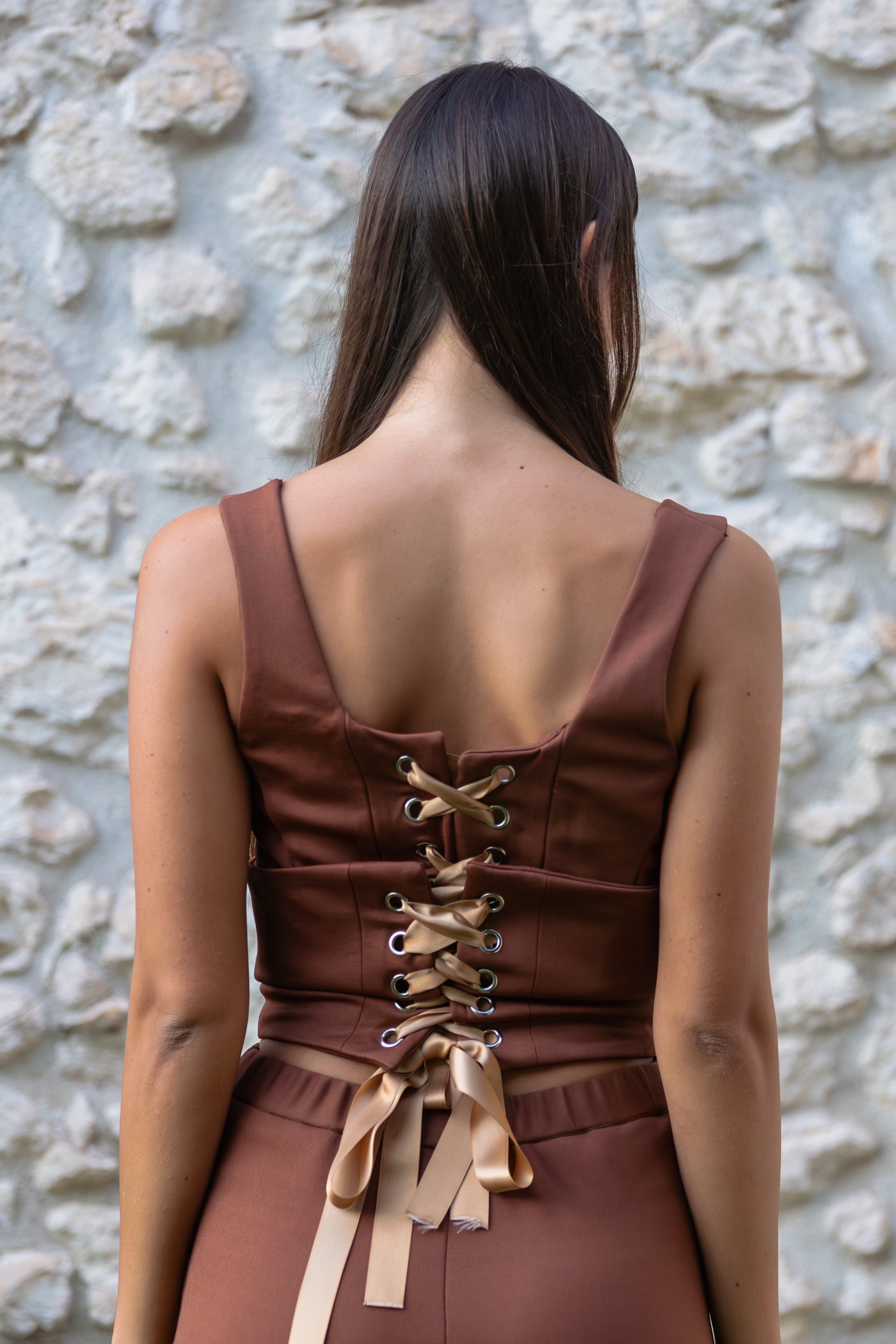 - Chiusura: incrocio posteriore con occhielli in metallo e nastro di raso regolabile.