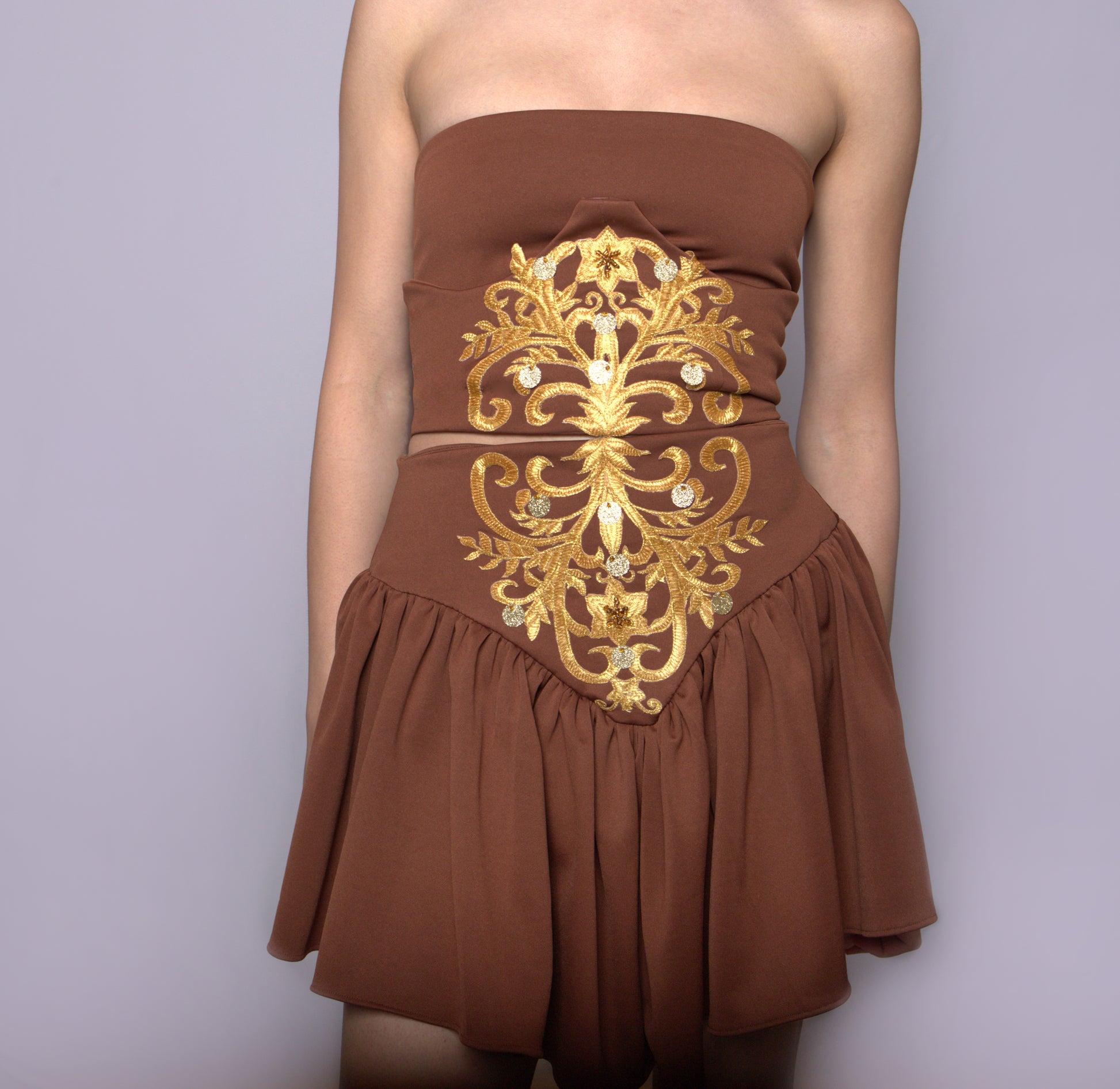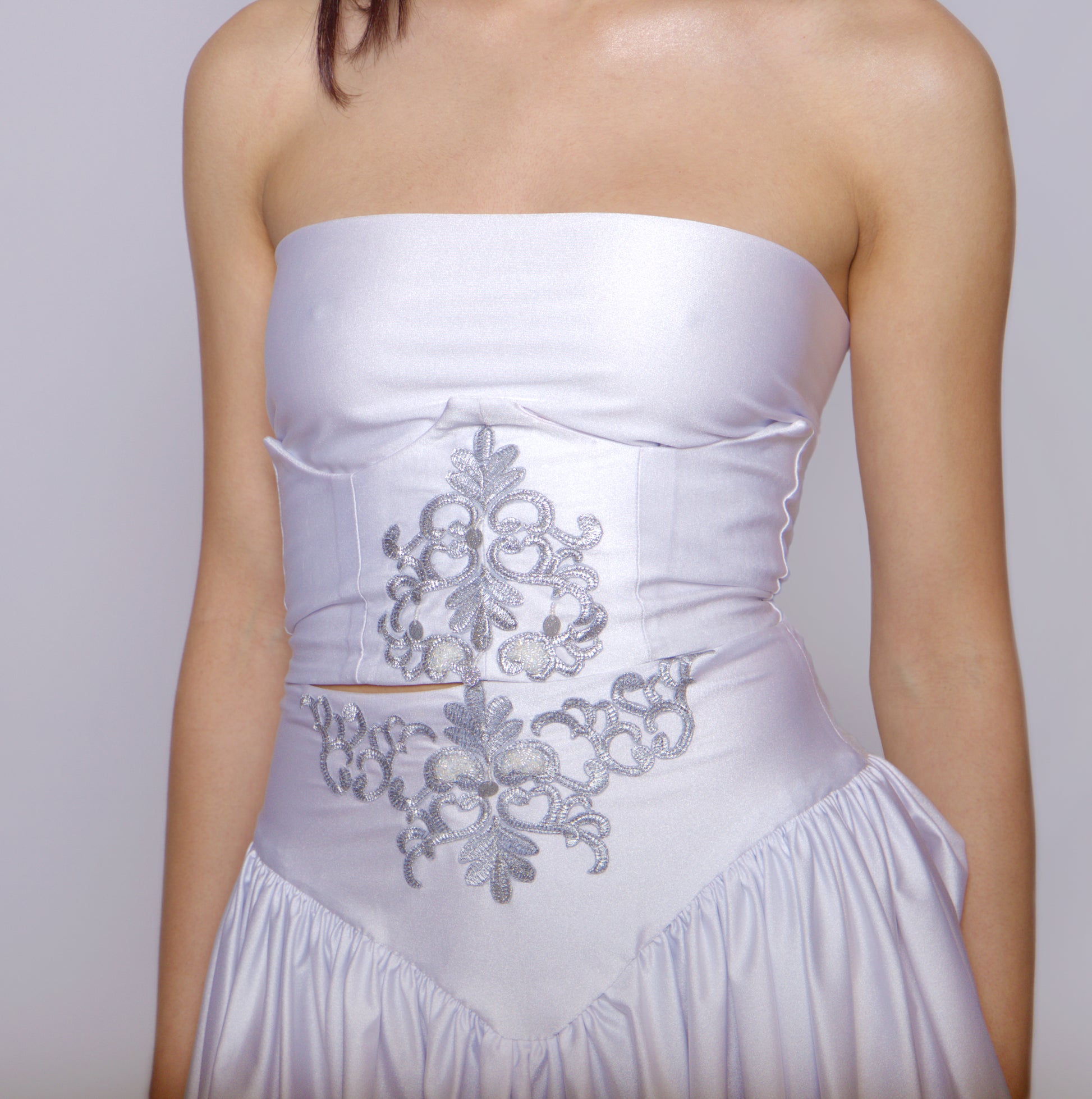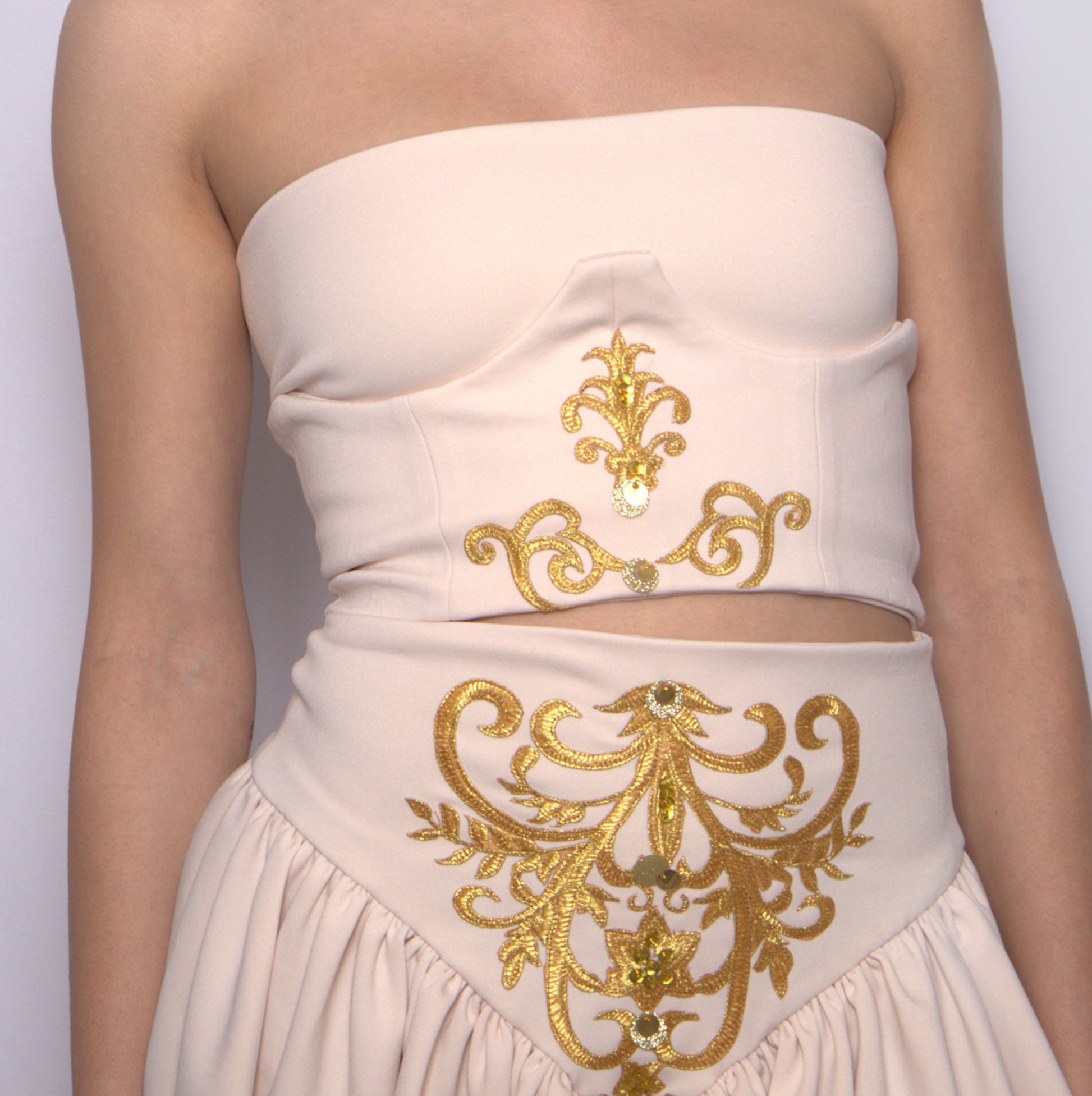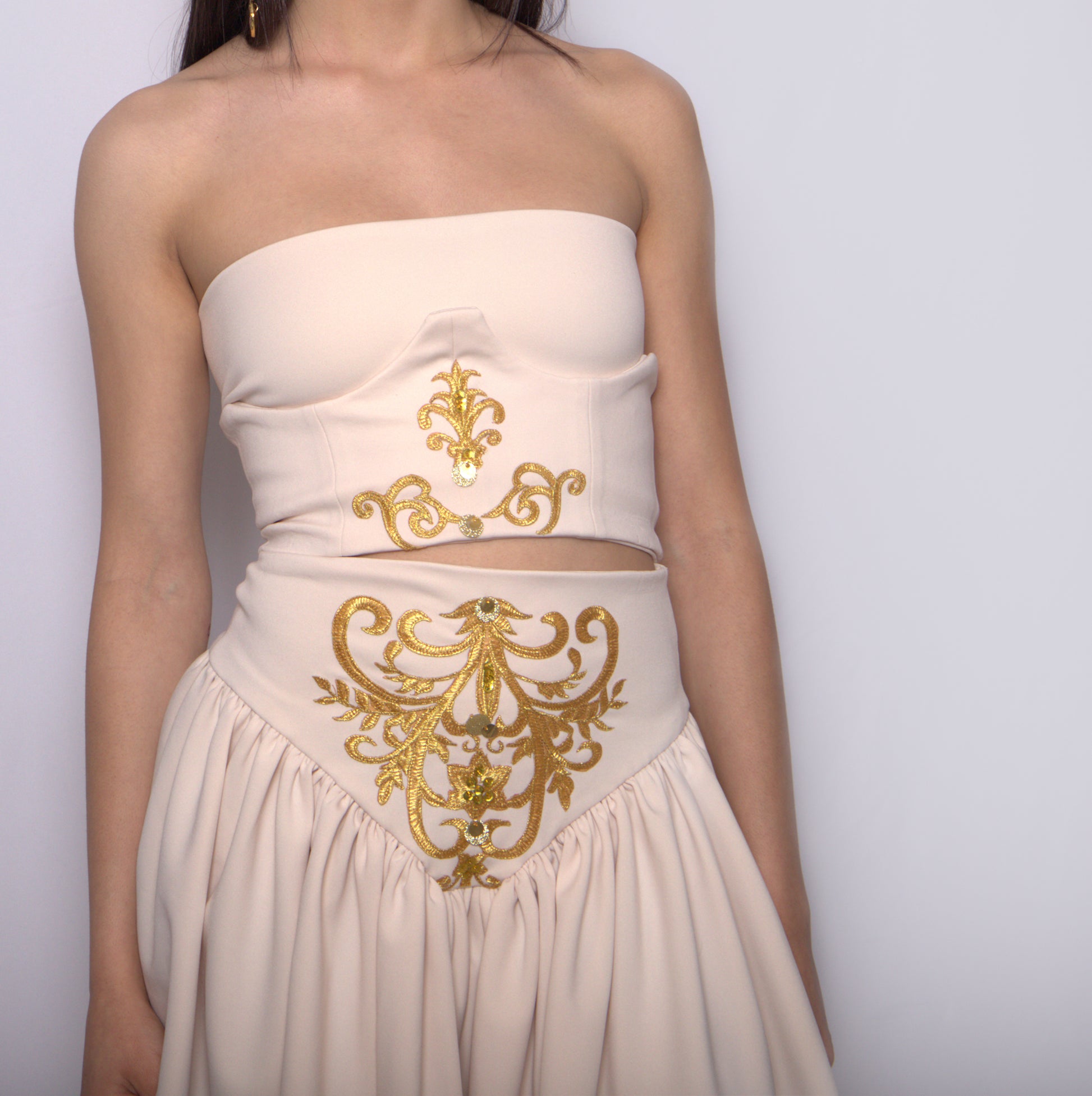 Raffinato e sagomato con applicazione di ricamo color oro sulla variante Avorio e Tabacco, argento nella variante ghiaccio. Paillettes e perline cucite rigorosamente a mano. La chiusura a incrocio con nastro di raso permette un'ottima vestibilità per tutti i corpi e veste più taglie. Confezionato a mano .