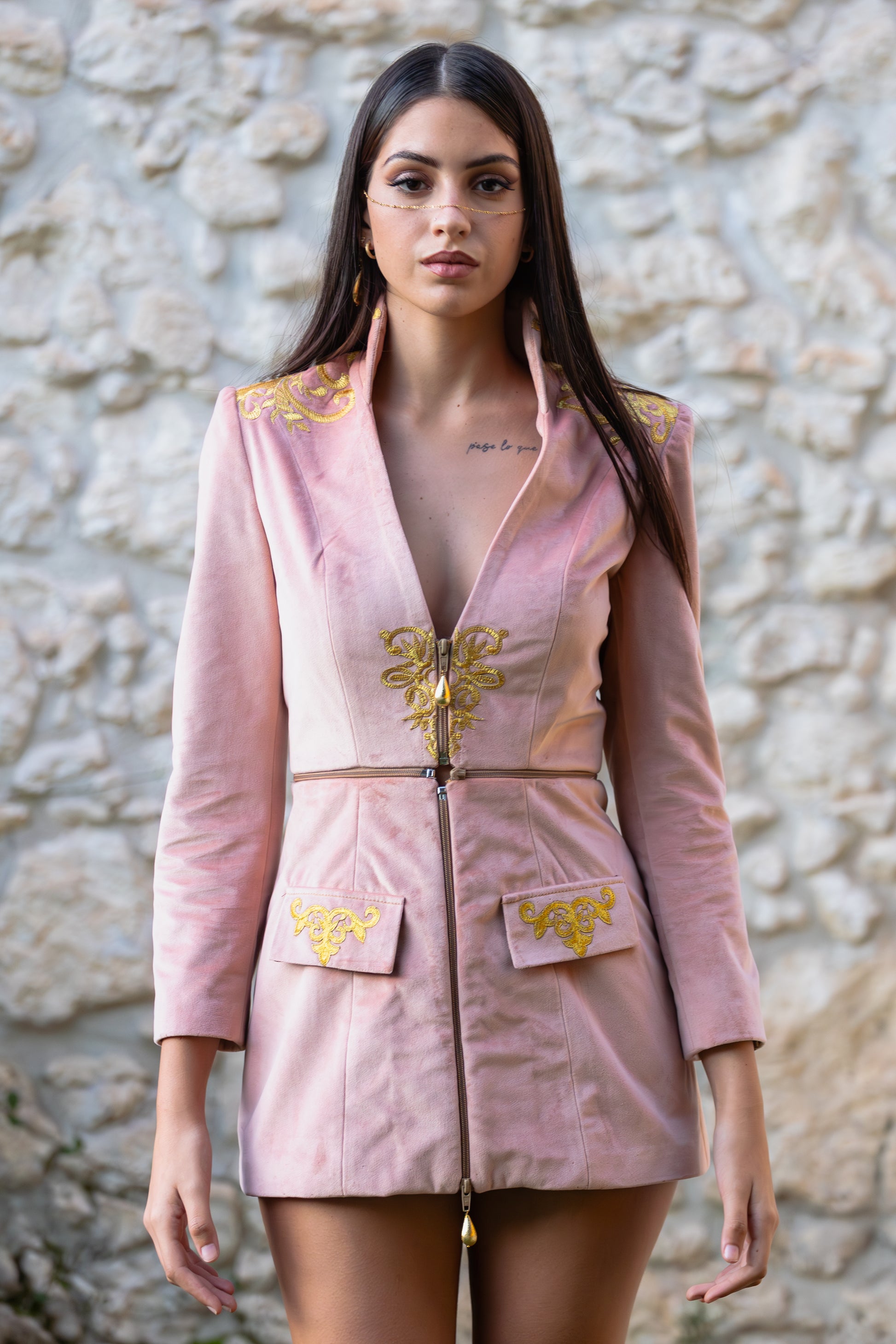 Le cerniere impreziosite, alcune delle quali decorate con gioielli pendenti, sono il cuore di questo capo. Grazie alla loro modularità, puoi scegliere di regolare la lunghezza, creare un look crop, allungare il capo per un effetto giacca di media lunghezza, o trasformarlo in un minidress per occasioni speciali. Per chi desidera un tocco ancora più elegante, è possibile aggiungere una coda, trasformando il look in una creazione sofisticata e dall'allure da red carpet.