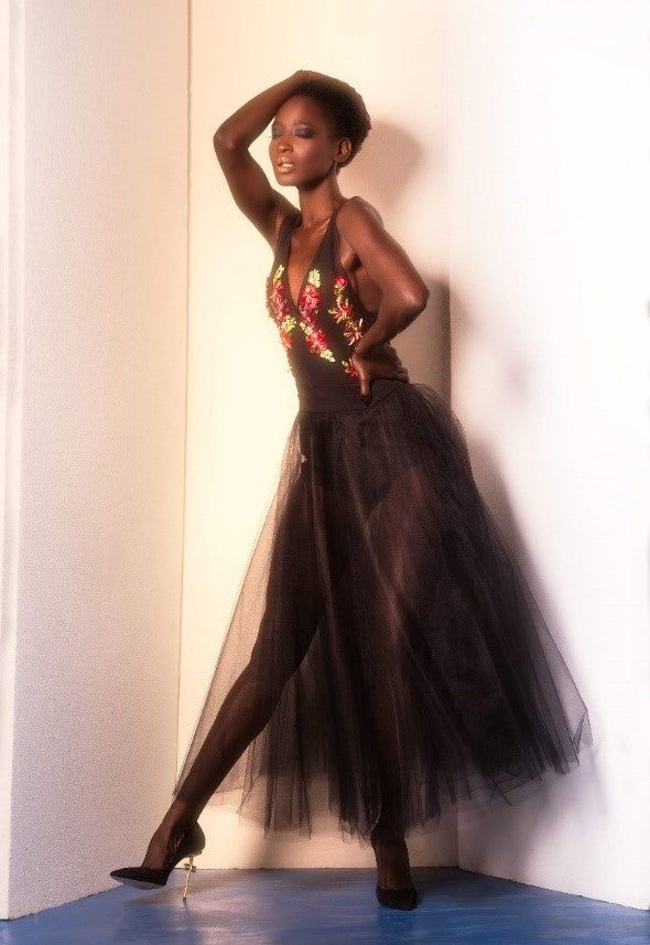 Gonna a ruota in tulle nero, a teli sovrapposti.