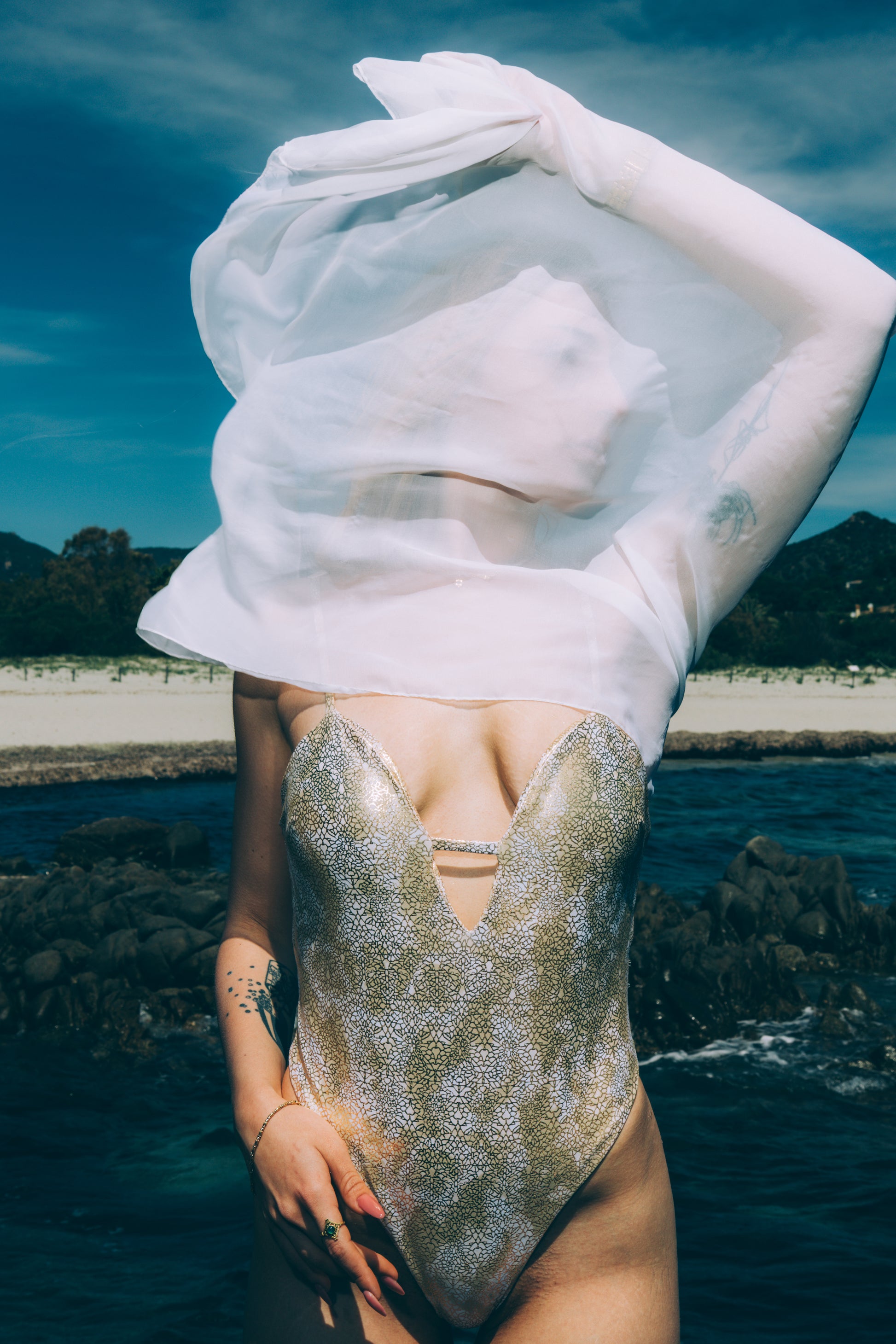 La sgambatura slanciante completa la figura, rendendolo perfetto sia come body mare di alta gamma, sia come capo serale per cocktail party, aperitivi sul rooftop o eventi estivi esclusivi.